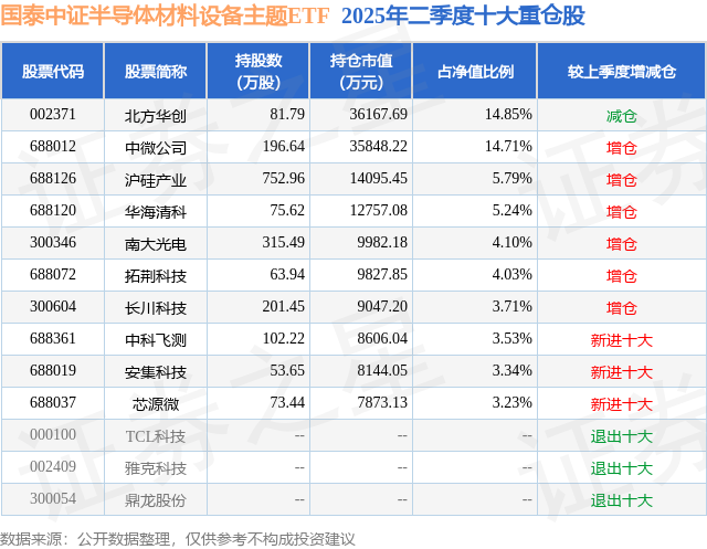 国泰中证半导体材料设备主题ETF的前十大重仓股如下: