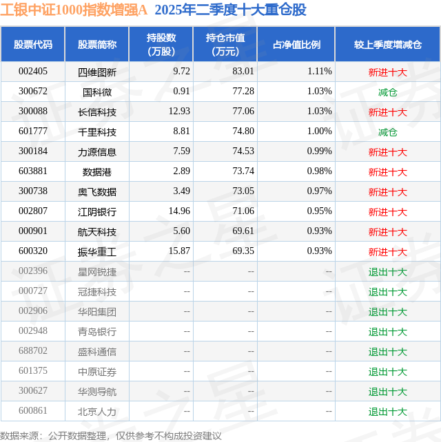 根据2025基金半年报公募基金重仓股数据,重仓该股的公募基金共1家,其中持有数量最多的公募基金为工银瑞信基金的工银中证1000指数增强A。工银中证1000指数增强A目前规模为0.31亿元,最新净值1.3407(9月1日),较上一交易日上涨0.59%,近一年上涨80.06%。该公募基金现任基金经理为何顺。何顺在任的基金产品包括:工银聚享混合A,管理时间为2023年10月20日至今,期间收益率为43.5%;工银新价值灵活配置混合A,管理时间为2024年4月1日至今,期间收益率为13.33%;工银瑞信中证港股通高股息精选ETF,管理时间为2024年5月30日至今,期间收益率为6.91%。