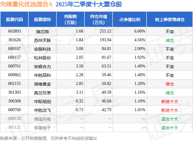 根据2025基金半年报公募基金重仓股数据,重仓该股的公募基金共1家,其中持有数量最多的公募基金为先锋基金的先锋量化优选混合A。先锋量化优选混合A目前规模为0.4亿元,最新净值1.8918(9月1日),较上一交易日下跌0.02%,近一年上涨44.64%。该公募基金现任基金经理为曾捷。曾捷在任的基金产品包括:先锋精一混合A,管理时间为2022年12月28日至今,期间收益率为53.3%;先锋聚利混合A,管理时间为2022年12月28日至今,期间收益率为68.93%;